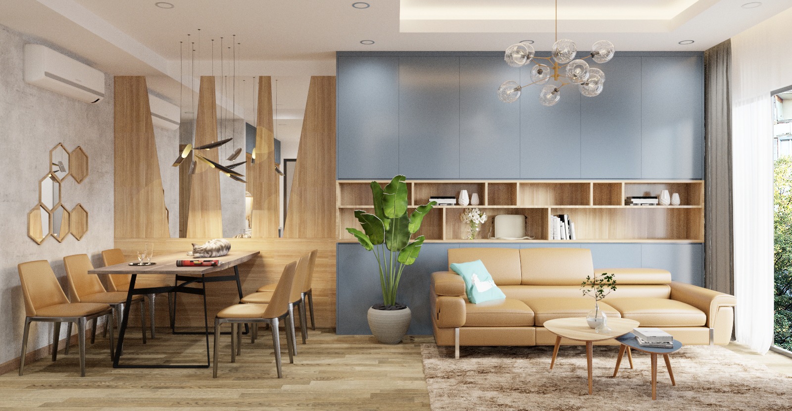 Phòng khách là bộ mặt của gia chủ, đặc biệt phòng khách phải thể hiện được rõ nhất “tinh thần” của phong cách thiết kế chủ đạo. Với diện tích không quá nổi bật, KTS đã lựa chọn nội thất có kích thước vừa phải kết hợp với lối thiết kế đơn giản cho phòng khách. Một chiếc sofa góc, một chiếc bàn trà gỗ khung sắt là điểm nhấn rõ thấy nhất của khu vực này. Bên cạnh đó vách ốp tivi bằng đá hay thảm trải sàn, kệ trang trí âm tường là những nét điểm xuyết để phòng khách sinh động hơn.
