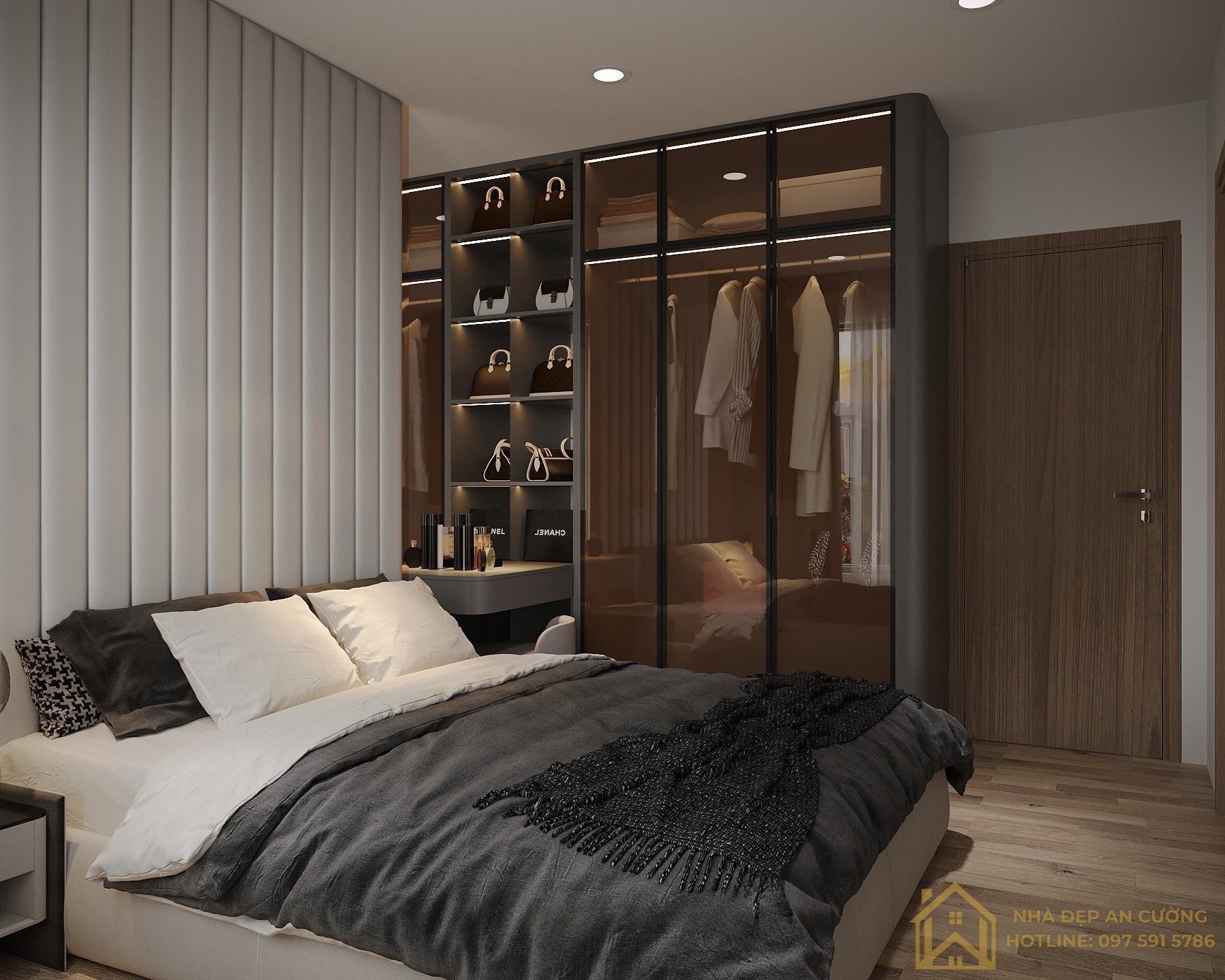 Phòng Ngủ Master – Vách Lanh Tô Và Tủ Kính Bronze